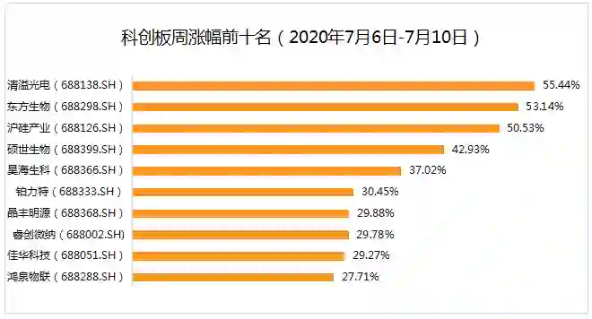 一周涨幅榜上,有精溢光电(688138.SH)、东方生物(688298.SH)、沪硅产业(688126.SH)名列前三,硕世生物(688399.SH)紧随其后。