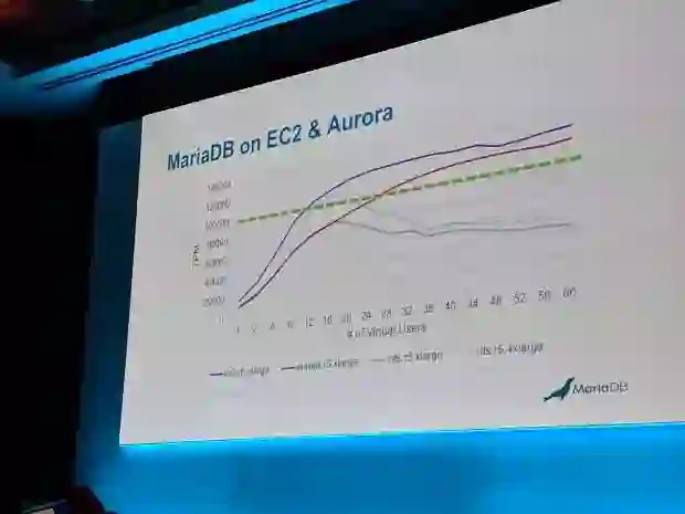 在第一场主题演讲中,MariaDB 的客户成功副总裁 Austin Rutherford 展示了基于 AWS EC2 的 HammerDB 基准测试的结果。HammerDB 是一款领先的企业 DBMS 基准测试和负载测试程序。在这些测试中,AWS 的默认 MariaDB 实例表现差强人意,AWS 自行开发的基于 MySQL 而建的 Aurora 一直更胜一筹。其中表现最出色的 DBMS 是基于 AWS 的 MariaDB Managed Services。