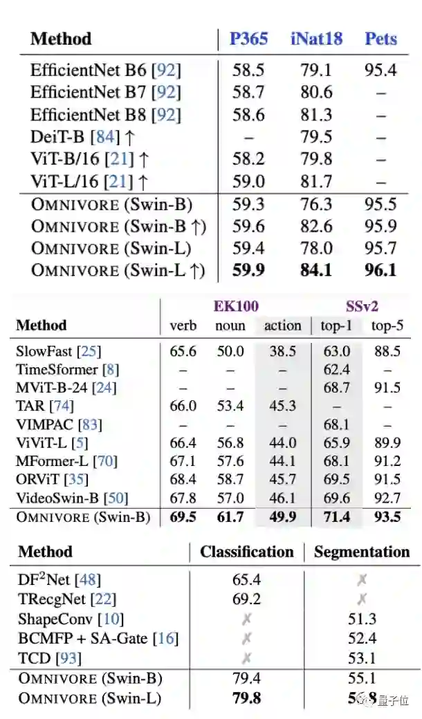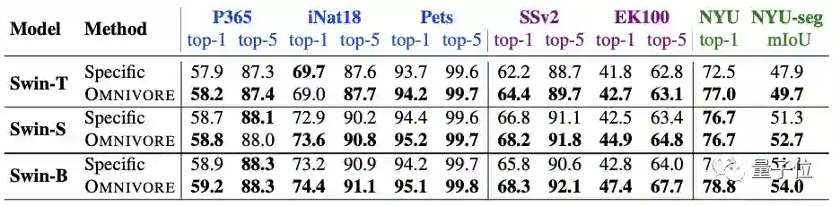 实验方面,首先将Omnivore与各视觉模态对应的特定模型(下表中指Specific)进行比较。
