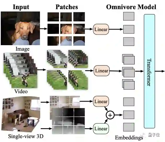 Omnivore会将输入的图像、视频和单视图3D图像转换为embedding,并馈送到Transformer中。
