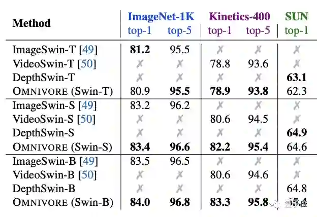研究人员在ImageNet-1K数据集、Kinetics-400数据集和SUN RGB-D数据集上联合训练出各种Omnivore模型。
