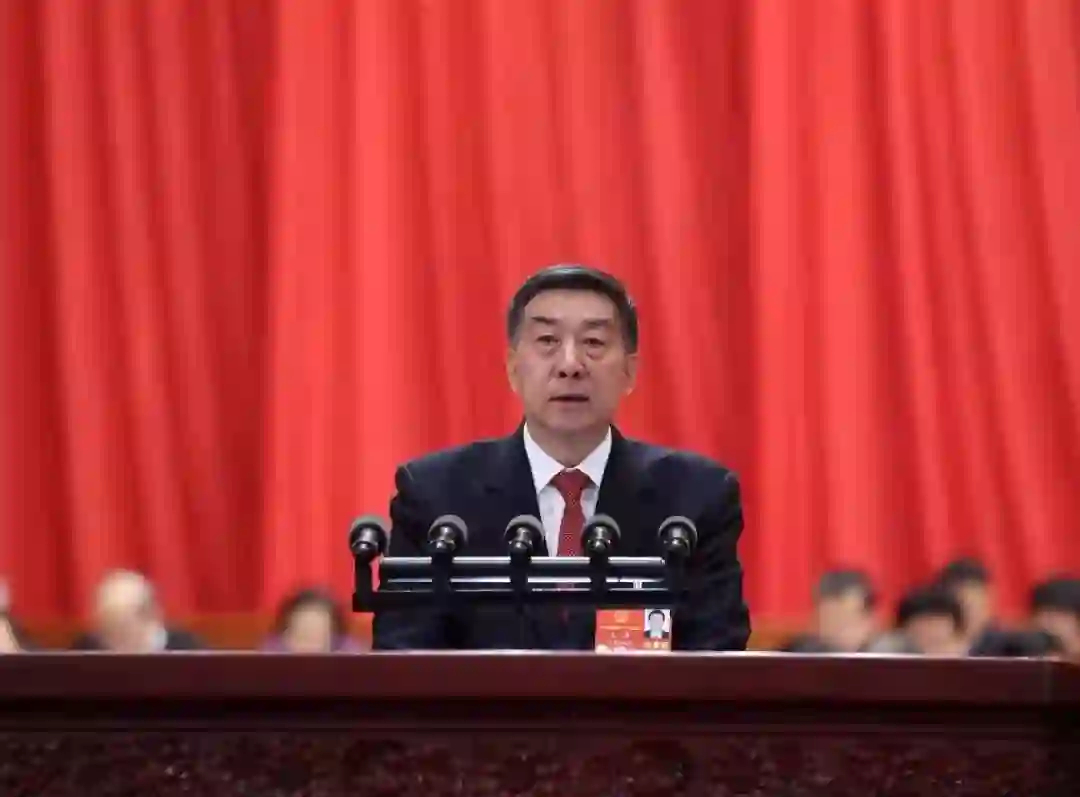 3月13日,受国务院委托,国务委员王勇作关于国务院机构改革方案的说明。(图片来源:新华社记者 王晔 摄)