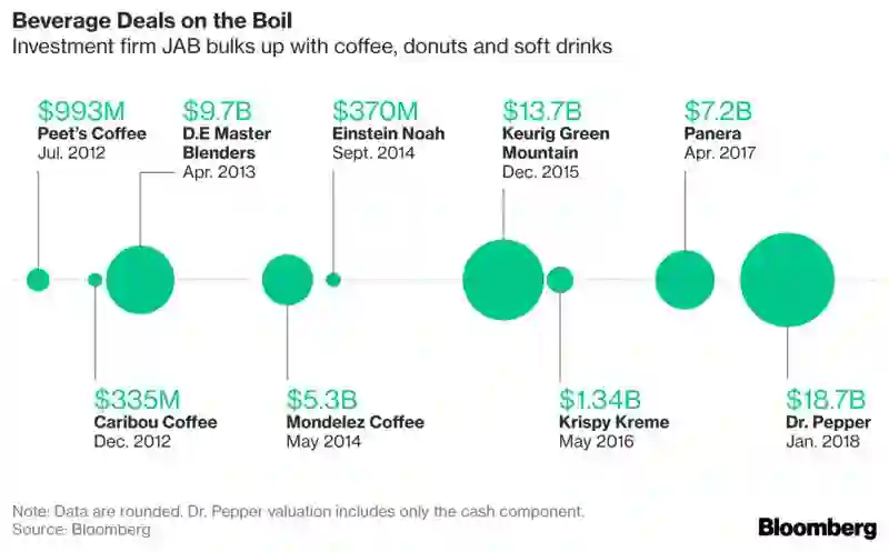 2018年1月29日,JAB旗下以单杯咖啡机而闻名的Keurig Green Mountain Inc.宣布将以187亿美元现金收购Dr Pepper Snapple Group Inc.。该交易将在美国缔造一个庞大的饮料分销网络,JAB2012年至2018年的并购交易总规模也将因此提升至580亿美元左右。投资基金来自奥地利亿万富豪赖曼(Reimann)家族及其他投资者的JAB正成为可口可乐公司(Coca-Cola Co.)和百事公司(Pepsi Co Inc.)的竞争对手。JAB旗下的品牌将包括七喜(7Up)、Fiji Water以及Peet's Coffee和Douwe Egberts咖啡等。JAB多年来巨大成功背后的一个秘密是该公司与其咖啡供应商之间的特殊关系。