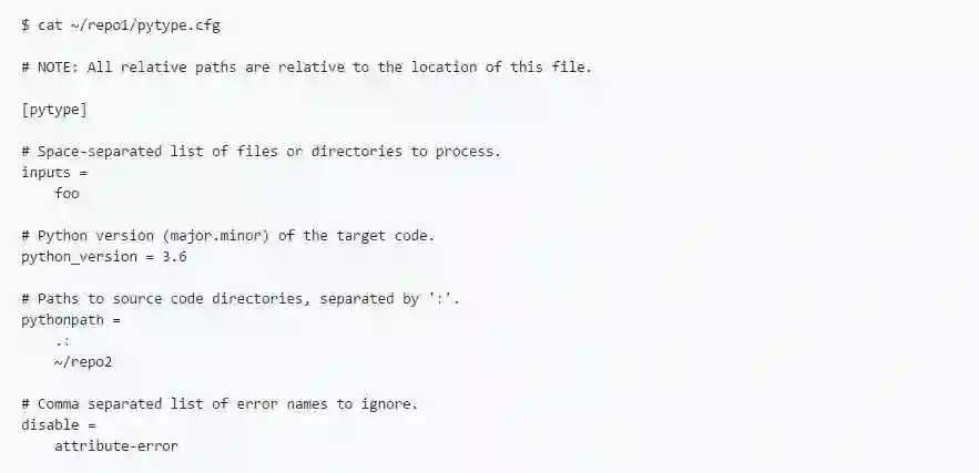 下面是设置好的配置文件,它将指示pytype将~/repo1/foo作为Python 3.6代码进行类型检查,在~/repo1和~/repo2中查找包,并忽略属性错误。注意,到包的路径不包括包本身。