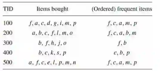 FP Growth是一种比Apriori更高效的频繁项挖掘方法,它只需要扫描项目表2次。其中第1次扫描获得当个项目的频率,去掉不符合支持度要求的项,并对剩下的项排序。第2遍扫描是建立一颗FP-Tree(frequent-patten tree)。