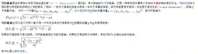 注:马氏距离一定要先给出样本集的统计性质,比如均值向量,协方差矩阵等。关于马氏距离的介绍如下: