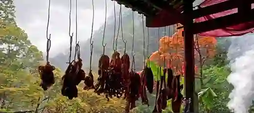 将洗净、修整好边角的猪肉用岩盐、花椒等调料均匀涂抹,置于陶缸中腌制两天,之后便是入炕熏制。为了最大程度地把木果香熏入肉中,我们特地选用柏树枝、柑橘皮以及核桃壳等混合熏制。满熏三日后,挂于檐下,靠山中清风自然风干,带走多余的柴禾气。