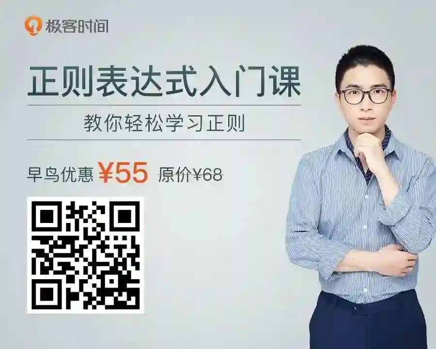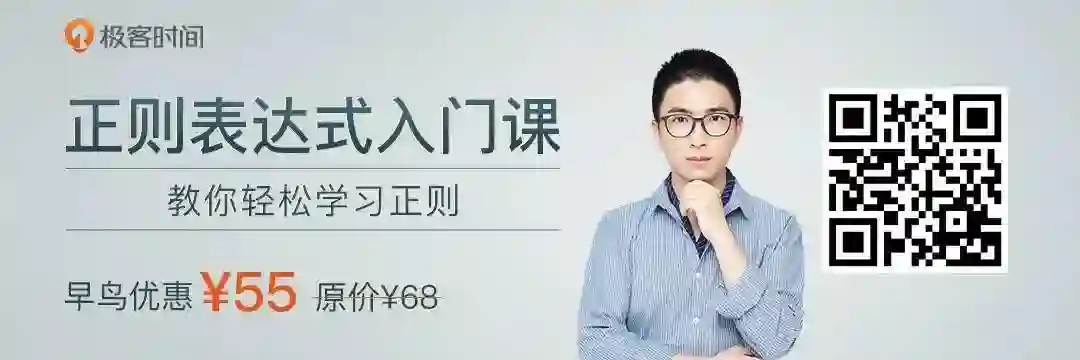 在视频中,关于正则记忆和使用,我提炼过一套学习图谱,得到了不少同学的热烈反响,但时长有限,无法展开细讲。所以,这次我在极客时间推出了《正则表达式入门课》专栏,想用通俗易懂的方式,给你套正则的系统学习路径,通过多场景的案例,带你实操正则应用,真正做到可以跨平台、多语言活学活用,让正则这个强大的工具在你手上发挥出真正的威力。