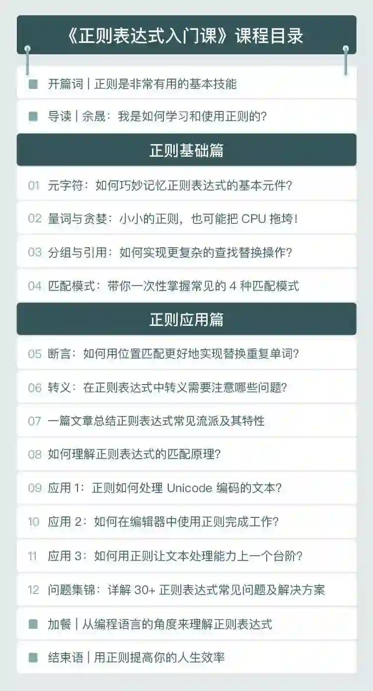 为了真正解决大家「系统学习正则」这一核心的需求,我在设计课程时,会先带你掌握正则重要的概念和功能,再以工作中的真实案例,带你实操应用。基于整个思路,课程共两个模块: