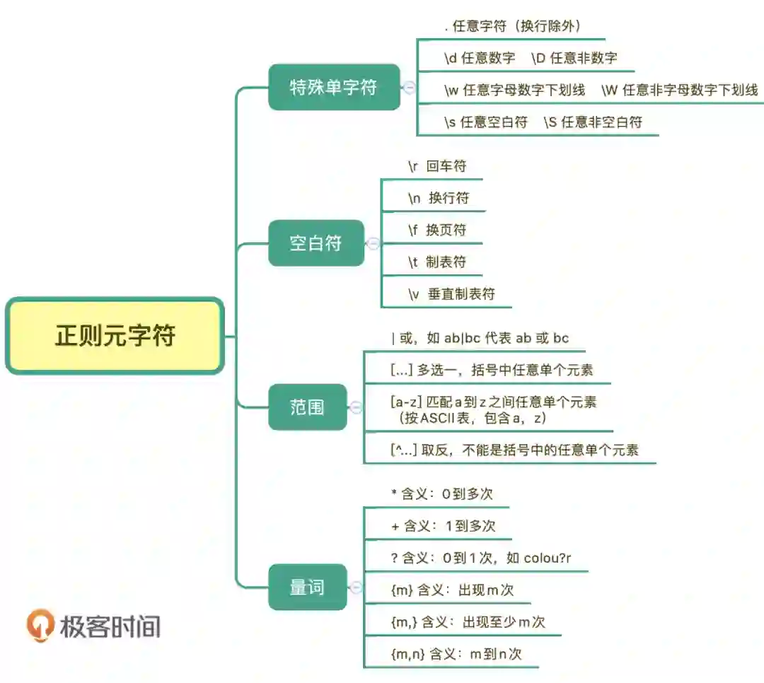 为了帮你事半功倍的学习正则,在这里,我也把我整理的记忆脑图中的“元字符”部分,分享给你,建议收藏👇