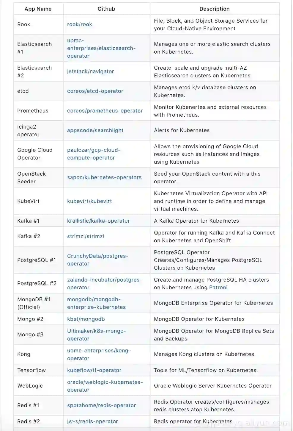 实际上,几乎在一夜之间,Kubernetes Operator 这个新生事物,就成了开发和部署分布式应用的一项事实标准。时至今日,无论是 etcd、TiDB、Redis,还是 Kafka、RocketMQ、Spark、TensorFlow,几乎每一个你能叫上名字来的分布式项目,都由官方维护着各自的 Kubernetes Operator。而 Operator 官方库里,也一直维护着一个知名分布式项目的 Operator 汇总。