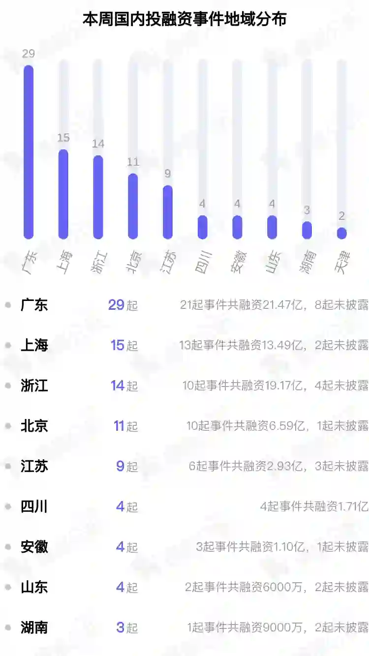 从本周披露获投企业的地域分布来看,主要集中在广东、江苏、北京。其中广东披露29个,上海披露15个,浙江披露14个。
