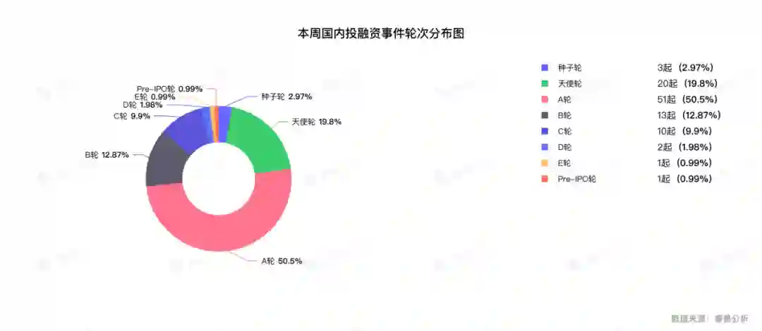 从本周披露获投企业的阶段分布来看,事件主要集中在A轮、天使轮和B轮,分别为A轮51个,天使轮20个,B轮13个。