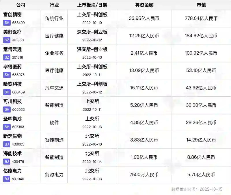 本周重点监测到国内IPO公司共10家。分别于A股主板、创业板、科创板和北交所上市,最新市值最高为「富创精密」278.04亿元人民币。