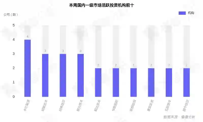 从机构投资活跃度来看,中芯聚源(4个)、君联资本(3个)、经纬创投(3个)、顺为资本(3个)在本周创投市场中较为活跃。