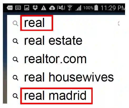 搜索引擎的搜索条目自动补全系统也是个好例子。它可根据用户输入的前几个字符把用户可能搜索的条目实时推荐自动补全。在笔者之一的某项工作里,如果系统发现用户刚刚开启了体育类的手机应用,当用户在搜索框拼出”real”时,搜索条目自动补全系统会把”real madrid”(皇家马德里,足球球队)推荐在比通常更频繁被检索的”real estate”(房地产)更靠前的位置,而不是总像下图中这样。