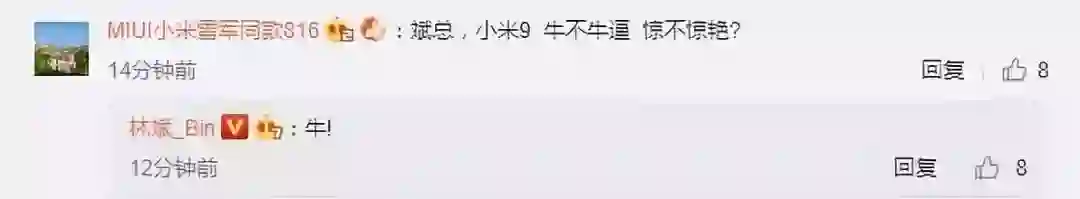 有米粉在小米联合创始人、小米总裁林斌微博下评论:“斌总,小米9牛不牛×、惊不惊艳?”林斌给出肯定回答:“牛”。