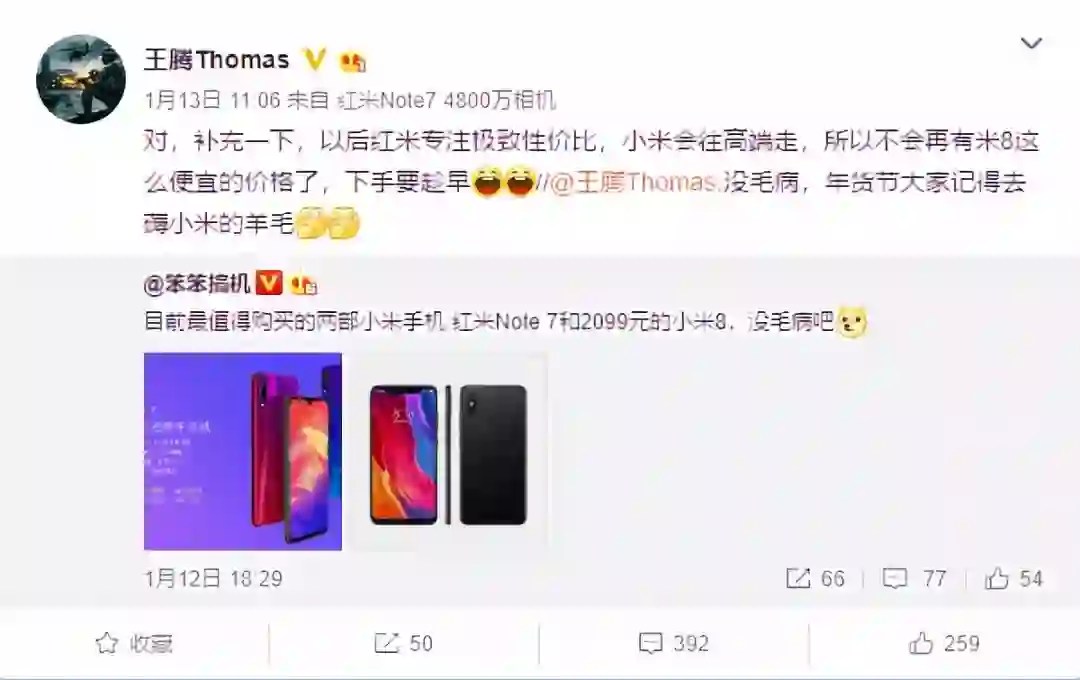小米公司产品总监王腾之前在微博上透露了这样一个信息:红米独立后,将往极致性价比走;而小米系列将走向高端系列。另外他还调侃到,以后不会再有小米8这种便宜的手机了。(言外之意就是:大家趁便宜赶紧去买啊!)