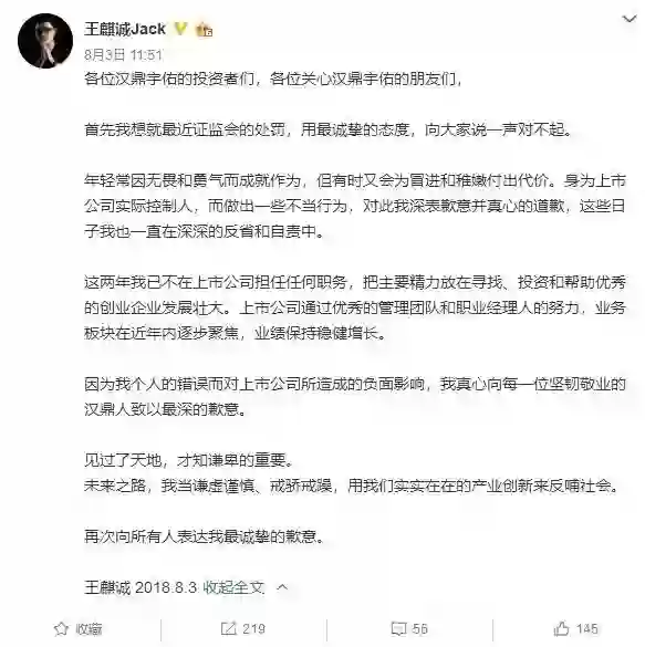 还有一起是曾经的“80后首富”、上市公司汉鼎宇佑实控人之一王麒诚,曾经借着公司筹划重大资产重组时以1500万用他人账户交易自家股票,还亏了48万,被证监会罚款40万。前天王麒诚在微博针对最近证监会的处罚,向投资者表达歉意。值得注意的是,拼多多上市后,“80后首富”已易主黄峥。