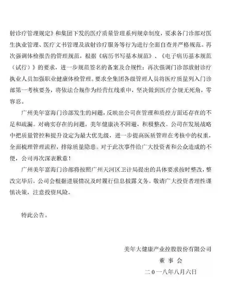 12.美年健康:下属单位收到整改通知书 公司已逐项落实整改