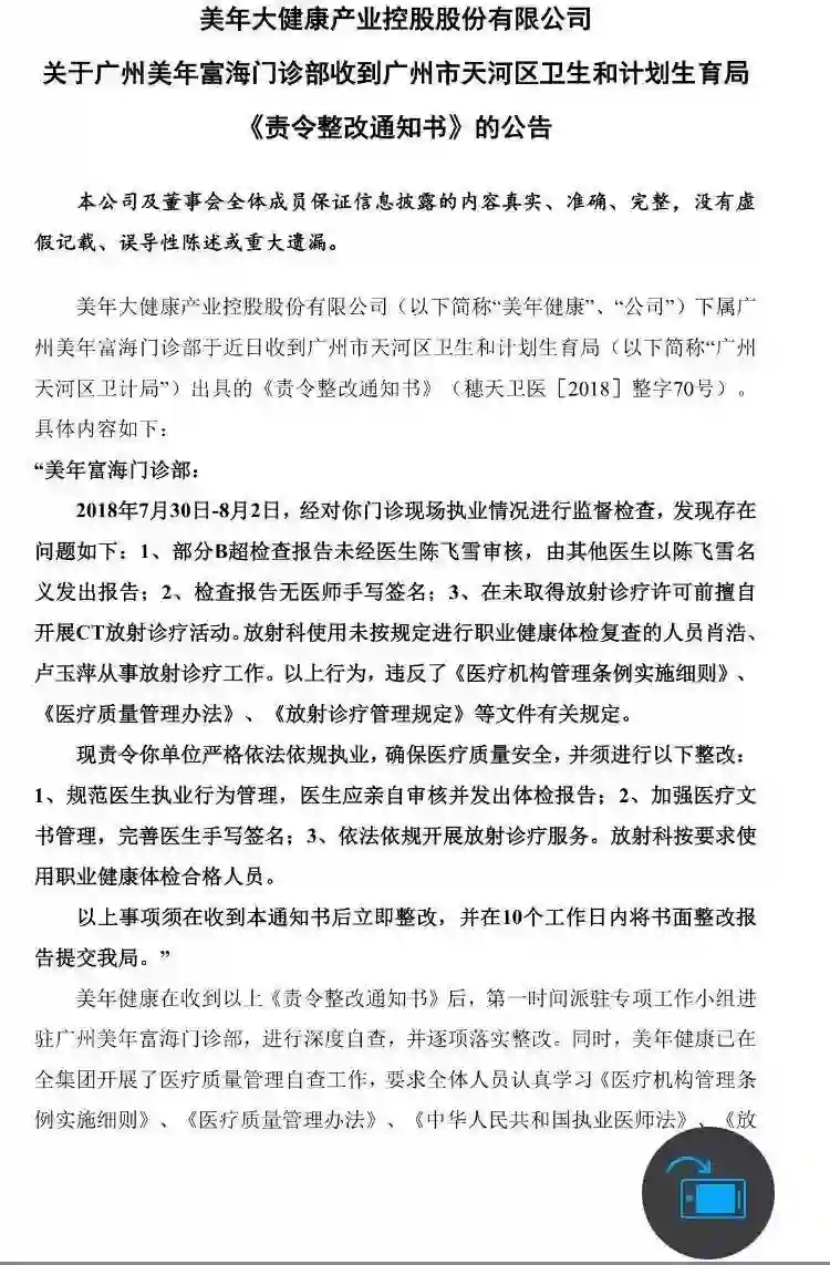 美年健康5日晚公告,广州美年富海门诊部收到广州市天河区卫生和计划生育局《责令整改通知书》,经查发现存在问题如下:1、部分B超检查报告未经医生陈飞雪审核,由其他医生以陈飞雪名义发出报告;2、检査报告无医师手写签名;3、在未取得放射诊疗许可前擅自开展CT放射诊疗活动。放射科使用未按规定进行职业健康体检复査的人员肖浩、卢玉萍从事放射诊疗工作。公司收到《责令整改通知书》后,第一时间派驻专项工作小组进驻广州美年富海门诊部,进行深度自查,并逐项落实整改,同时已在全集团开展医疗质量管理自查工作。