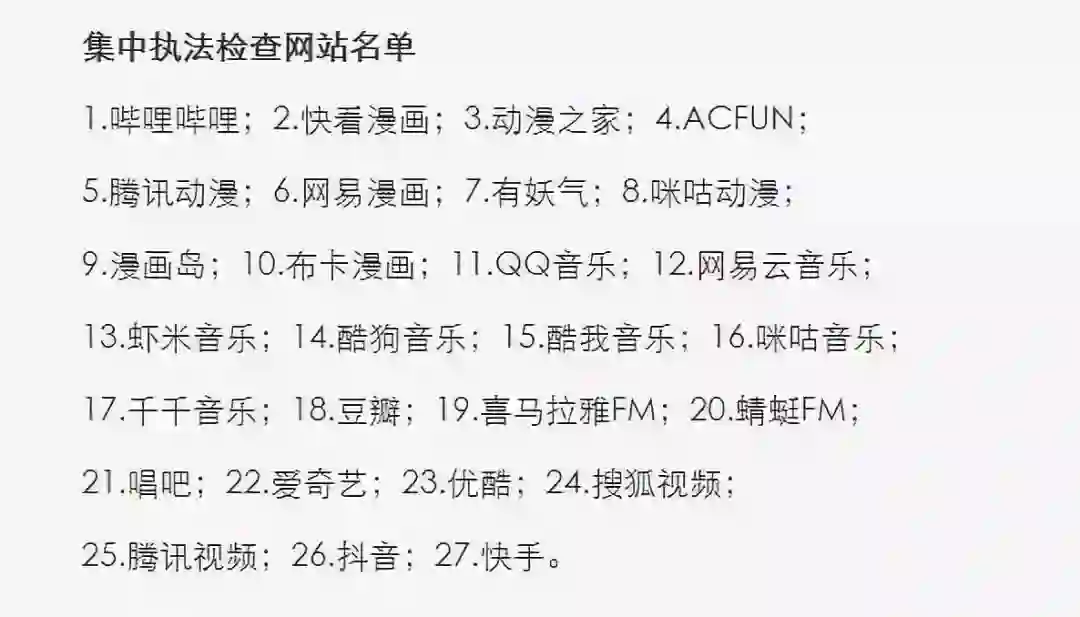近期,文化和旅游部开展专项查处工作,组织开展网络动漫、网络音乐市场集中执法检查。此次被列入检查对象名单的27家网站包括:哔哩哔哩、快看漫画、动漫之家、ACFUN等。针对一些网络音乐平台提供含有问题内容的网络音乐产品,相关部门指导各地文化市场综合执法机构依法立案调查,并将依法做出行政处罚。(新华社)