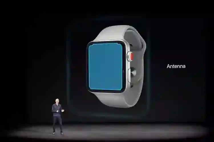 和之前预测的一样,Apple Watch Series 3 增加了 LTE 版本,可以独立于手机实现通话、数据同步等功能。Apple Watch Series 3 采用了内置的 SIM 卡方案(eSIM 卡),整个屏幕都是通信的天线部分(并不是之前预测的红色表冠部分)。