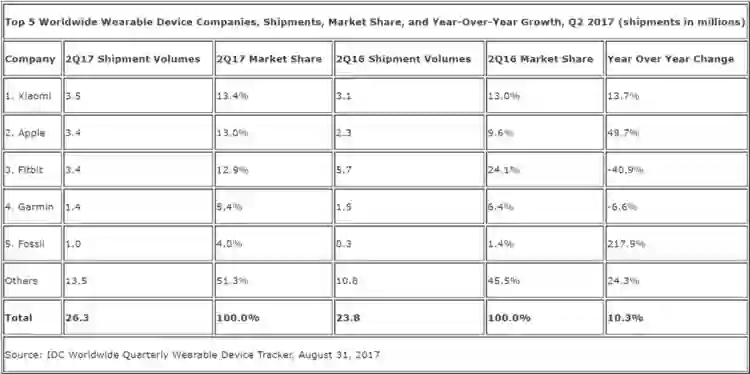 根据 IDC 公布的 2017Q1 季度全球可穿戴市场销量数据,小米以 350 万只销量位居第一,苹果以 340 万只位居第二。两者相似的地方在于产品线都比较精简,没有 Fitbit 那般丰富;但一个是售价低廉的智能手环,一个是相对高昂的智能手表,售价几乎相差了一个数量级,所以苹果销量的「含金量」还是非常高的。