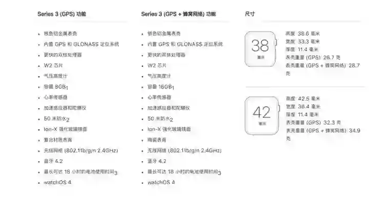 其他功能上,Apple Watch Series 3 和上代产品保持一致,包括 GPS 模块,50 米防水等。Apple Watch Series 3 两个版本的区别参考下图: