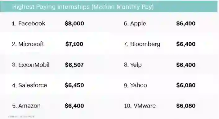排名第一的是Facebook,实习生的月工资中位数为8000美元,如果按年薪计算相当于9.6万美元,几乎是美国员工工资中位数(51336美元)的近两倍。