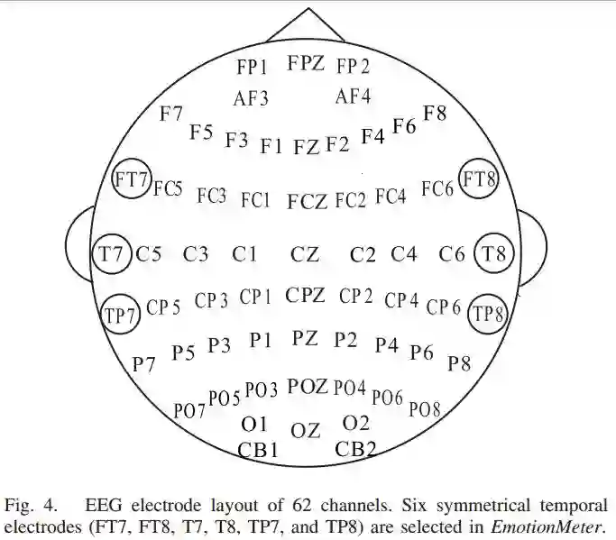 本文工作:本文设计了一种包含 6 个对称颞叶电极的电极放置方式,可以很容易地嵌入到耳机或眼镜框架中。为验证本文算法的有效性,设计了四种情绪(高兴、悲伤、恐惧和中性)的识别实验。