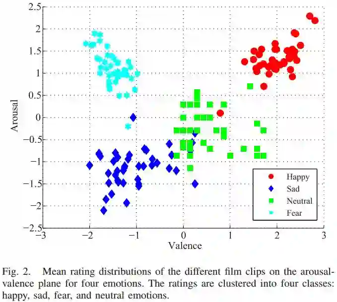 在我们的材料库中,共有 168 个包含四种情绪的电影片段,44 位被试(22 位女性,均为大学生)被要求在观看电影片段时评估他们的情绪状态(在 valence 和 arousal 两个维度下进行评分(-5~5))。