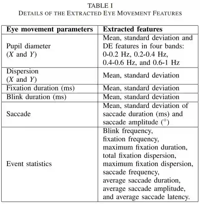 我们应用线性动态系统(linear dynamic system)方法来滤除与 EEG 特征无关的噪声和伪迹。表 1 中显示了从眼球运动数据中提取的各类特征信息。