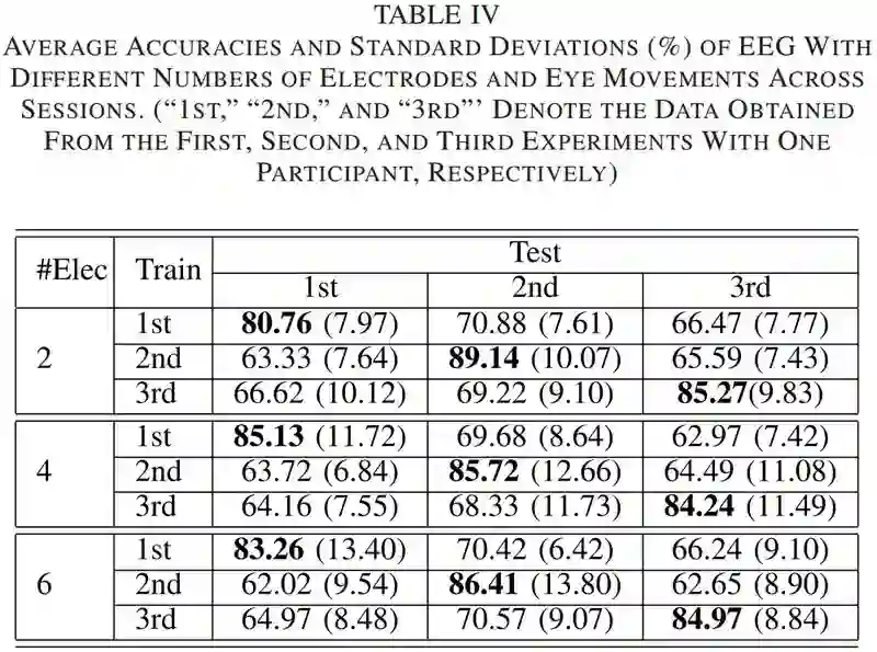 我们选择来自相同被试的不同 session 的总频带 DE 特征和眼动数据特征,构成训练和测试数据集。表 IV 列出了两个,四个和六个电极配置下的平均识别准确率和标准差。这些结果证明了 EmotionMeter 框架的相对稳定性。