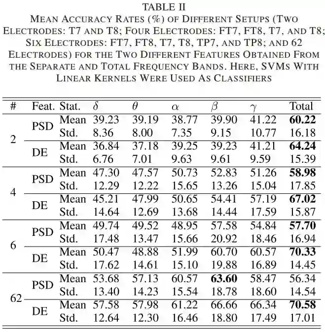对于两个电极(T7和T8),四个电极(T7,T8,FT7和FT8)和六个电极(T7,T8,FT7,FT8,TP7和TP8)的 PSD 和 DE 特征的尺寸分别为 10,20 和 30。