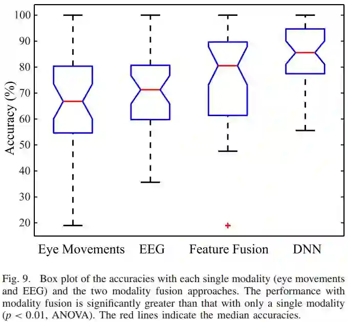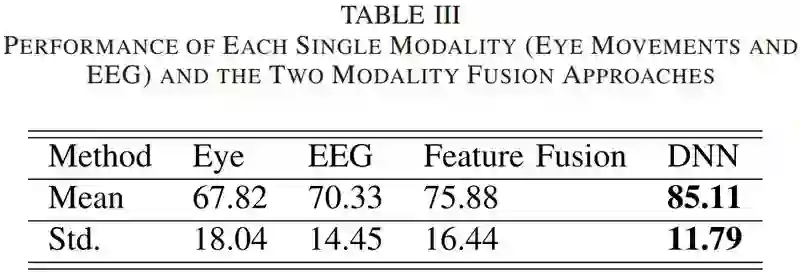 表 III 显示了每种单一模式(眼球运动和脑电图)和两种模态融合方法的表现,图 9 显示了使用不同模态的准确度盒形图。