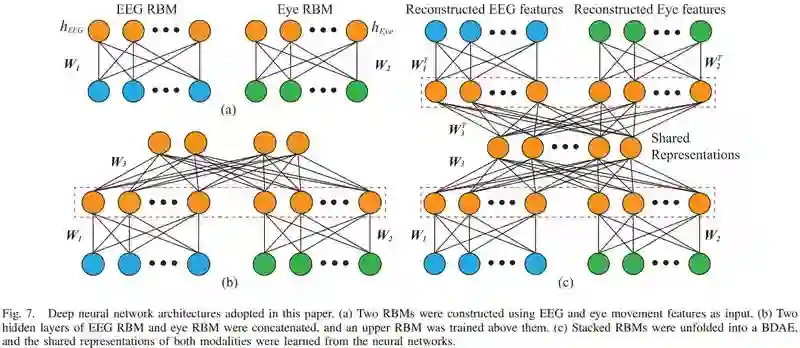 为了提高识别性能,我们采用双峰深度自动编码器(bimodal deep auto-encoder, BDAE)来提取脑电图和眼球运动的共有表示。图 7 描述了本文提出的深度神经网络的结构。