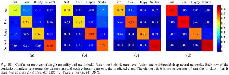 为了进一步研究脑电图和眼动数据的互补特征,我们分析了每种模态的混淆矩阵,揭示了每种模态的优缺点。图 10 和图 11 分别给出了基于眼动数据和脑电图的混淆图和混淆矩阵。实验结果表明脑电和眼动数据对情绪识别具有不同的判别力。结合这两种模式的互补信息,模态融合可以显着提高分类精度(85.11%)。