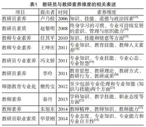 单从“专业发展”的角度来看,不同主体的素养体系层级或框架之间其实并无本质的差别。因此,教研员素养体系层级划分应注重对其他专业(职业),特别是教师素养体系研究的借鉴。此外,应遵循两条研究原则:(1)遵循教研员素养发展的内在本质规律,保证科学性;(2)尊重“专业素养”研究的普遍性认识,以保证体系层级划分的规范性。在此基础上,梳理相关研究对专业素养维度的划分,如下页表1所示。