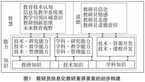溯源教研员信息化教研素养发展的本质及规律,素养各层级的具体内涵要素的确立,应遵循“建构知识—生成能力—升华智慧、涵育道德”层级发展的历史顺序逐级构建。