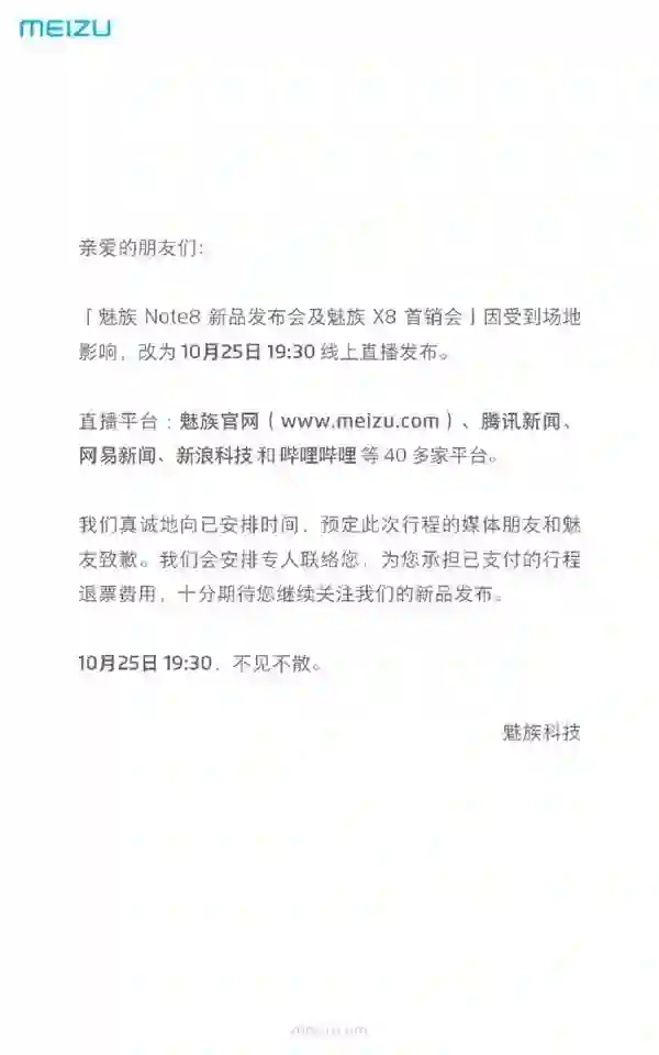 公告称,魅族Note8新品发布会及魅族X8首销会,因受到场地影响,改为10月25日19:30线上直播发布。直播平台包括魅族官网、腾讯新闻、网易新闻、新浪科技和哔哩哔哩等40多家平台。