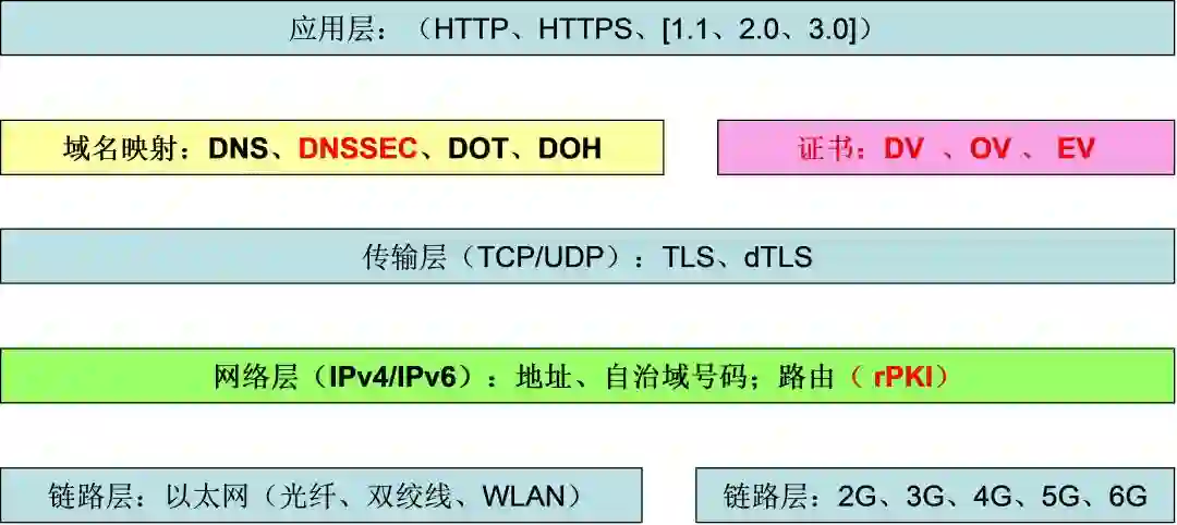 按照互联网分层模型,目前明确列出发展路线的主流技术如图6所示。