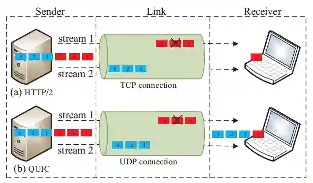 QUIC的多路复用机制是指通过单个传输连接发送多个数据流。在访问HTTP服务器时,由于HTTP/1.1一次只能请求一个资源,客户端通常需要建立多个并发的TCP连接,这种方式导致了复杂的连接管理以及低效的端到端资源的使用(每个连接都要从慢启动开始增加拥塞窗口)。HTTP/2则通过在一个TCP连接上进行多路复用来解决该问题。然而即使不同流(stream)的数据内容是相互独立的,如图5(a)所示,某条stream上的数据丢失仍然可能导致队头阻塞,因为TCP连接要求所有数据按照发送顺序传送到应用程序。在QUIC的设计中,如图5(b)所示,QUIC也支持在单个连接上复用并发的HTTP stream,一个QUIC连接可以携带相同或不同stream的多个帧,属于同一stream的所有帧按顺序传送。与HTTP/2不同的是其中一条stream中的丢包不影响其他stream的数据传输。