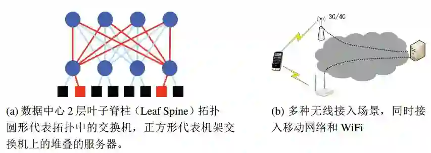 在过去十年中一个与TCP协议密切相关的协议,多路径TCP(Multipath TCP, MPTCP)在IETF(Internet Engineering Task Force)被提出[24-25]并且逐渐的正在被标准化[26]。如图2所示,它主要有两个应用场景,一个是数据中心网络,还有一个是多种无线接入网络。在这两个场景中端到端之间存在多条路径,即端到端之间存在多个带宽来源,但是TCP协议只能够让端系统的一个连接使用一条路径。