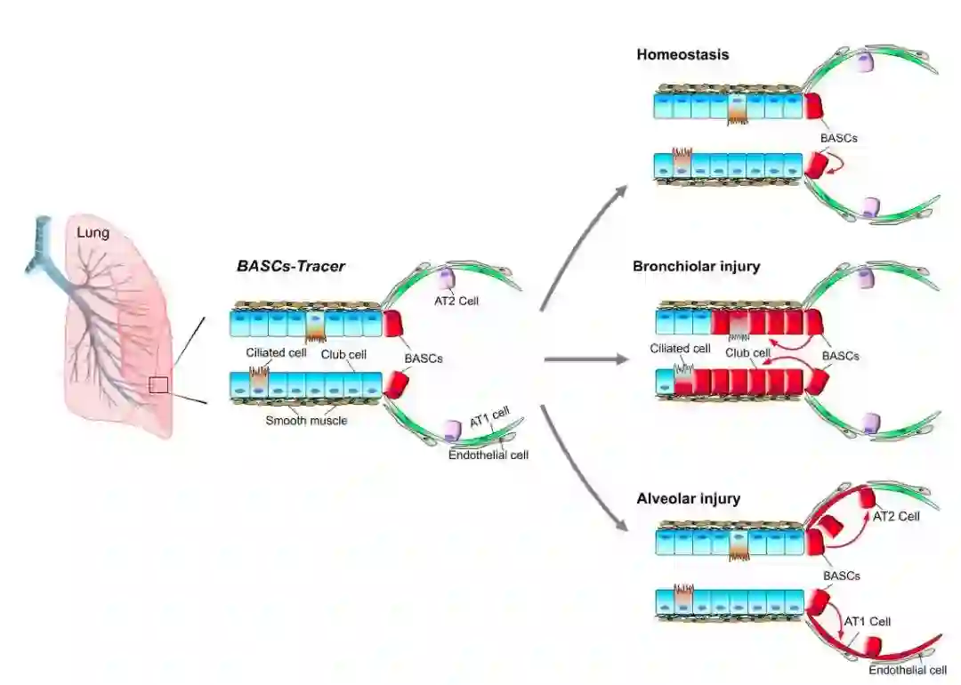 图注:肺多能干细胞BASCs能够促进肺损伤修复再生。利用BASCs-tracer可以特异性标记并示踪CC10+SPC+BASCs。在支气管损伤后,BASCs能分化为支气管上皮club cell、ciliated cell,而在肺泡损伤后BASCs能分化为肺泡上皮AT2和AT1 cell。