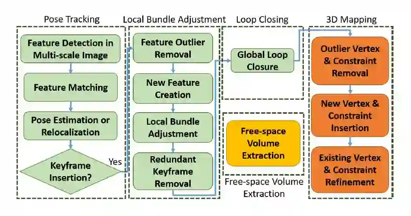 它由五个线程组成。姿态跟踪线程估计出每一帧的相机姿态,并决定是否插入关键帧。如果由新的关键帧插入,那么局部的捆集优化将被执行,相机的局部姿态和特征点的空间位置将被调整。回环检测部分和全局的优化在另外的线程中执行。3D的建图线程将优化过的稀疏特征点转化成稠密的体积表达。自由空间体积提取线程会定期输出最新的自由空间量,用于运动规划的使用。