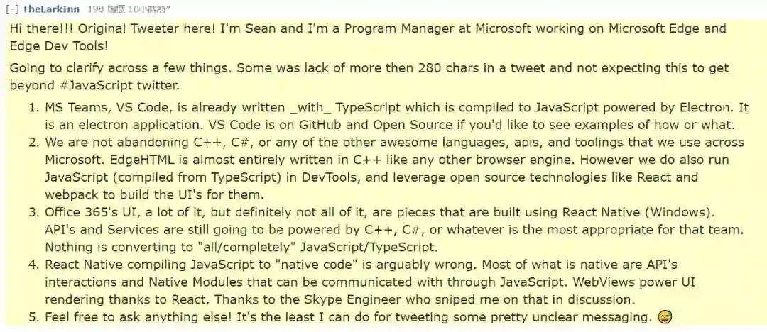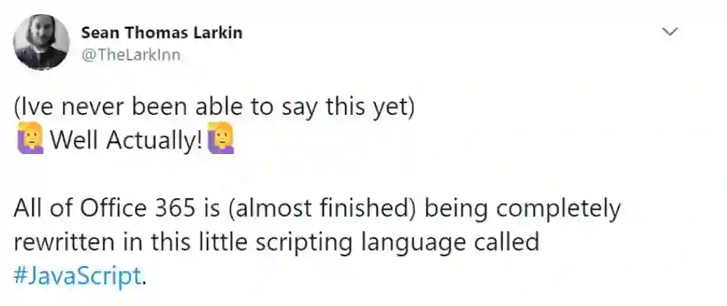 作为开发者布道师,同时也是 JavaScript 拥趸的 Sean 直接让他打脸,Sean 回复 Twitter 表示,Office 365 套件的所有应用都被重写了,并且工作已进入尾声,而完成这项工作使用的正是那个弱小的脚本语言 JavaScript。