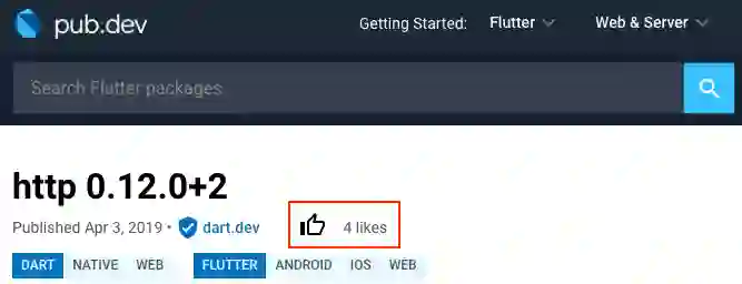 我们还在 pub.dev 上发布了 "为代码包点赞" 功能,方便大家 "亲手" 表明自己对代码包的喜爱。如果您想要为一个代码包点赞,只需点击代码包详情信息旁边的大拇指图标即可。