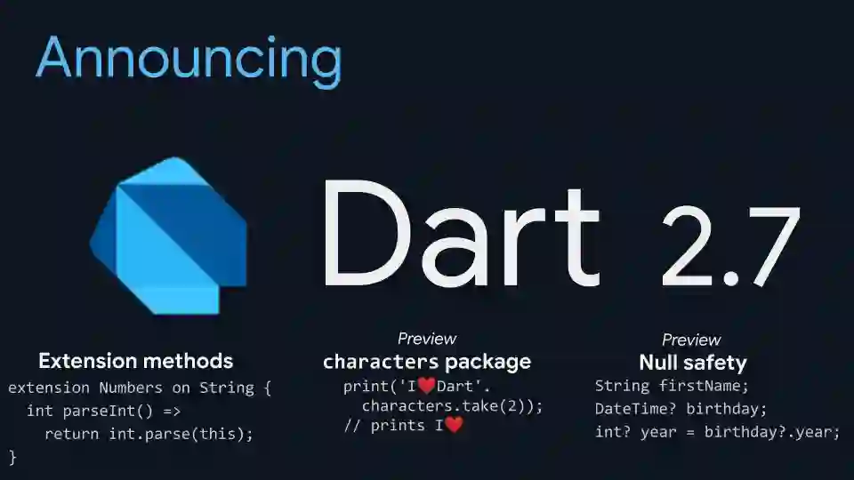 Dart 2.7 增加了对扩展方法的支持,此外还添加了一个新的代码包,用来处理带有特殊字符的字符串。我们更新了空安全 (已经实现类型安全的可空和非空类型),还通过 DartPad 带来了全新的代码体验环境 (而且支持空安全)。在生态系统层级,pub.dev 现在加入了新的点赞 (Like) 功能,用户们喜欢代码包如今更加一目了然。Dart 2.7 现在就可以从 dart.dev 下载并作为 SDK 使用,并且它也包含在发布的 Flutter 1.12 中。