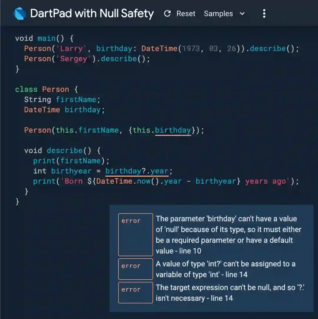 现在我们把这段代码粘贴进我们新推出的空安全代码体验环境,它是 DartPad 的一个特殊版本,其中包含静态分析功能 (是空安全功能的子集) 的技术预览。甚至都不需要运行代码,我们就可以看到 3 个问题: